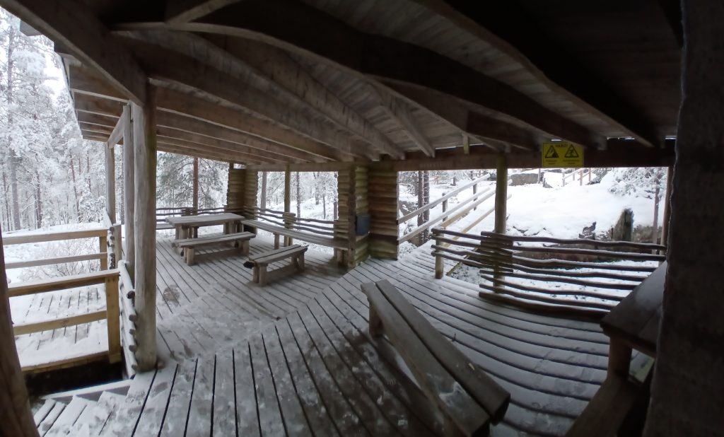 Pakkasta kymmenisen astetta ja kova tuuli. Onneksi nuotipaikka oli suojaisa ja siinä oli mukava paistella makkaroita. Kaiken kaikkiaan aika harmaa päivä. Lunta sen verran että maa valkoisena, mutta ei kyllä mistään kinoksista voi vielä puhua.