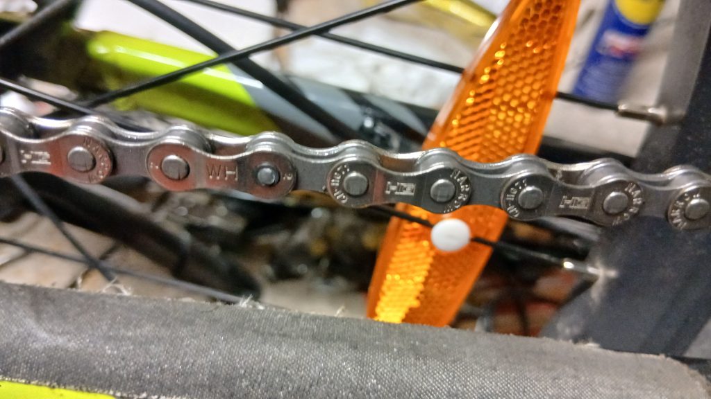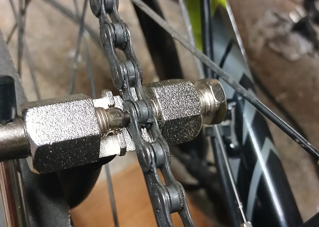 Ketju piti kasata niittaamalla, mutta onneksi ostin ketjun katkaisimen niin sekin kävi suhteellisen helposti. Voimaa tuntui vaativan, mutta kyllä se tiensä paikalleen löysi. Liitoskohdasta tuli yhtä notkea kuin viereisestäkin.