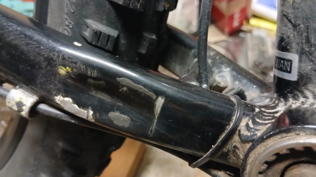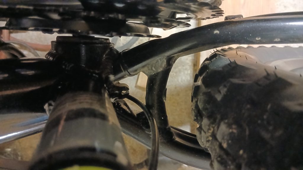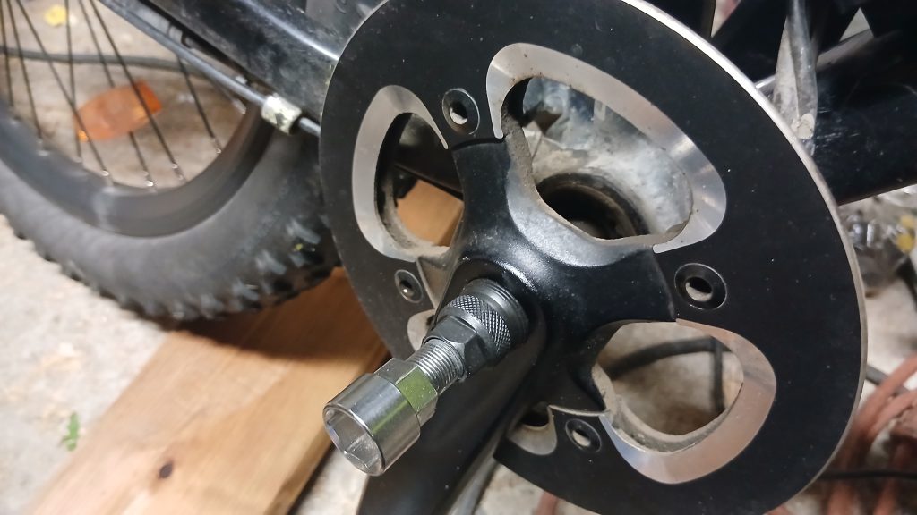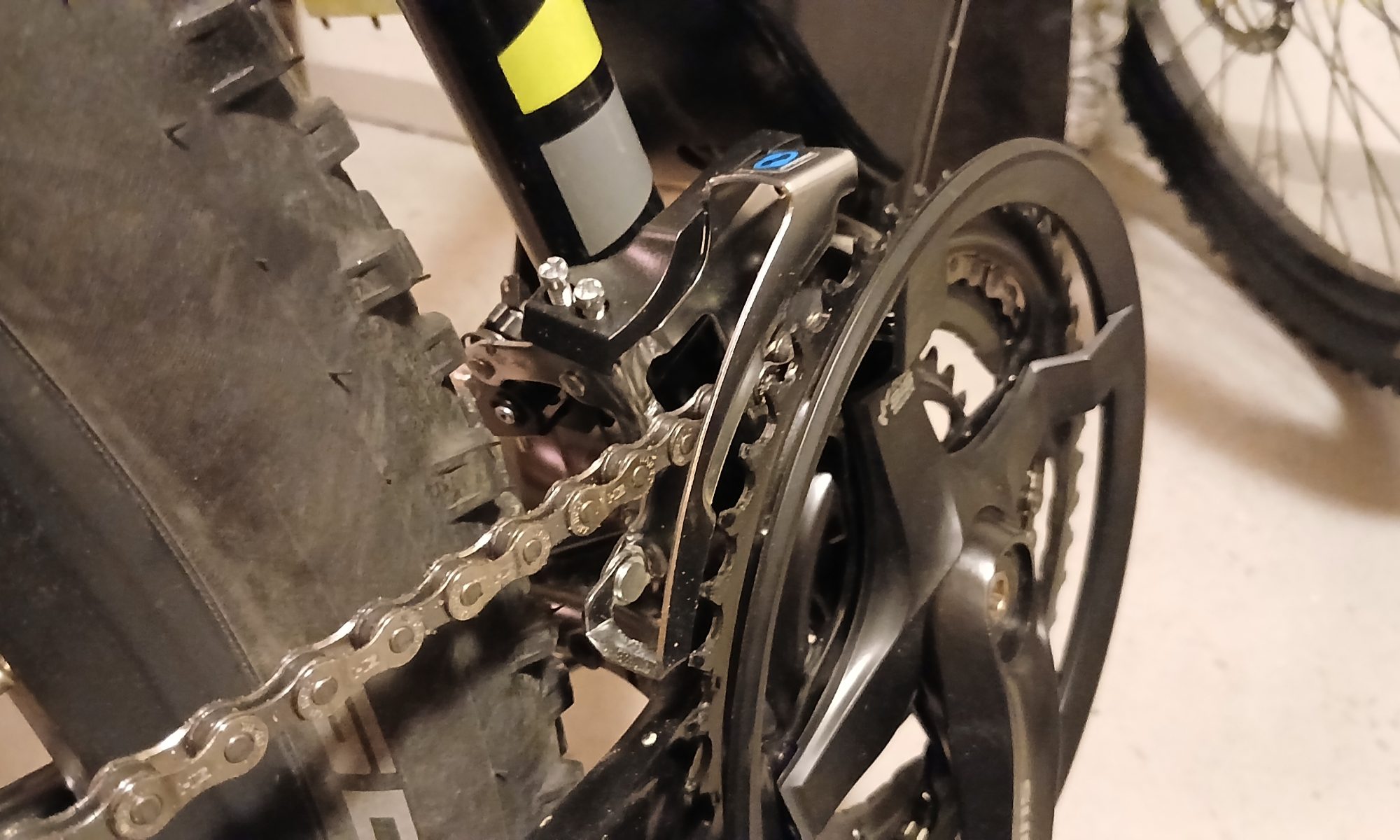 Vanhoja kampia on turha koittaa saada irti ilman ulosvetäjää. Tuolla kuitenkin lähti ihan helposti ja pääsin mallailemaan uusia kampia paikalleen. Johtuen vasemmalla olevasta poljinanturista, pienin hammasratas tulee todella lähelle takahaarukkaa. Melkein on tilaa, mutta ei sitten kuitenkaan. Jääpä jälki mistä hiertää.