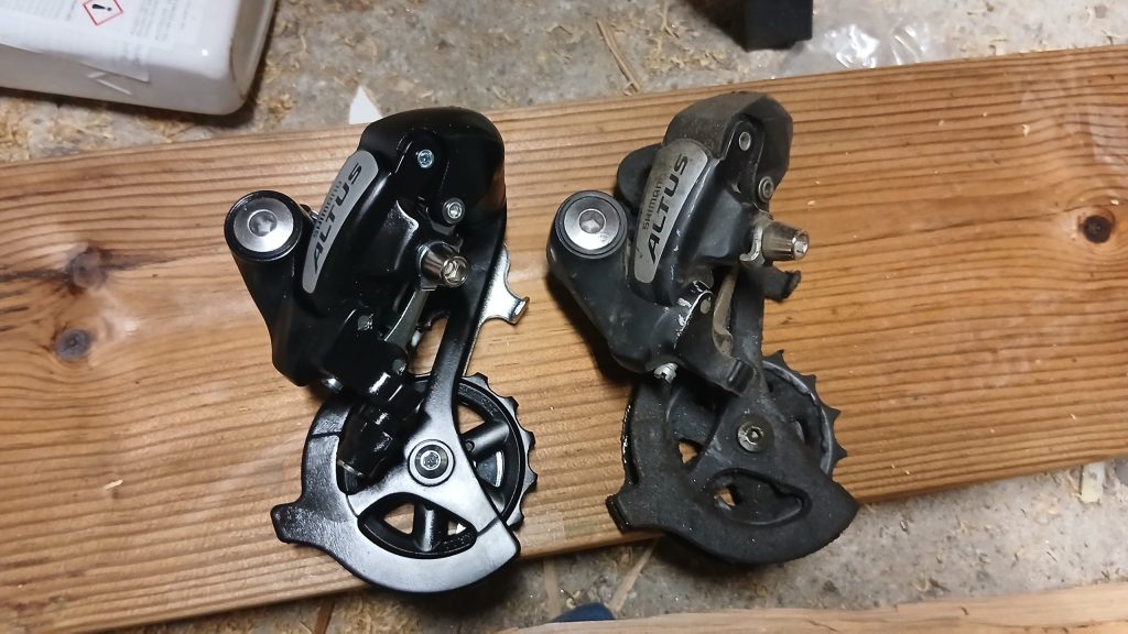 Vaihtajiksi eteen ja taakse tuli Shimanon Altukset, ihan perus vaihtajat ja varmaan halvimmat mitä löytyy. Samanlaiset kuin siellä on ollut ennenkin. Eipä se aiemmin pistänyt silmään, mutta onhan nuo hampaat aika lailla jo kuluneet teräviksi. Eka 9500km meni alle kymmenellä rasvauksella ja siirtäjien säätöihin ei tarvinnut koskea kertaakaan. Mulle ihan riittävän laadukkaat.