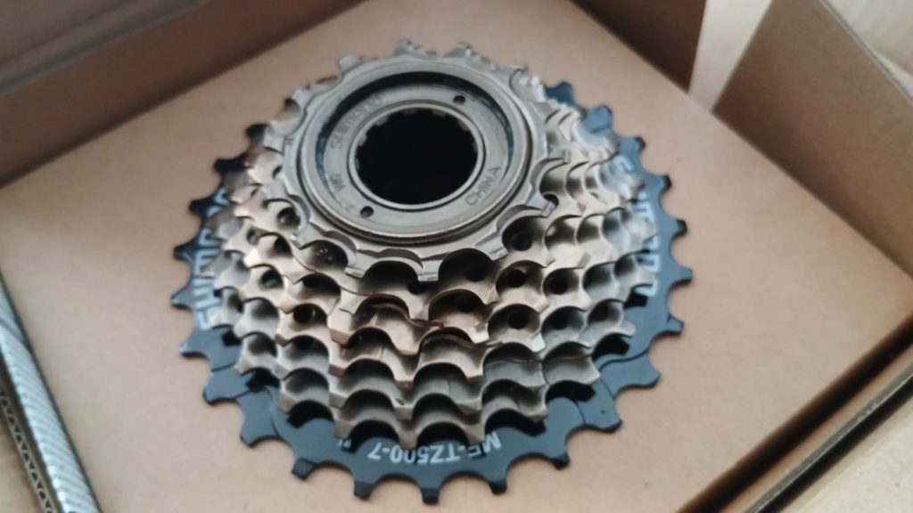 Taakse löysin samanlaisen kiekon kuin vanha. Shimanon MF-TZ500 14-28T. Siinä on vapaaratasmekanismi sisäänrakennettuna. Biltemasta piti hakea sopiva hylsy jolla sai sen irti. Lujassa tuntui olevan, jatkovarrella en saanut siihen tarpeeksi voimaa että olisi irronnut. Rengas jousti sen verran ettei saanut terävästi voimaa. Piti laittaa se hylsy ruuvipenkkiin ja vääntää renkaasta. Tuntui kuin alumiini olisi antanut periksi, mutta ei se sitten sitä ollutkaan. Pientä puunausta ja uusi pakka paikalleen.