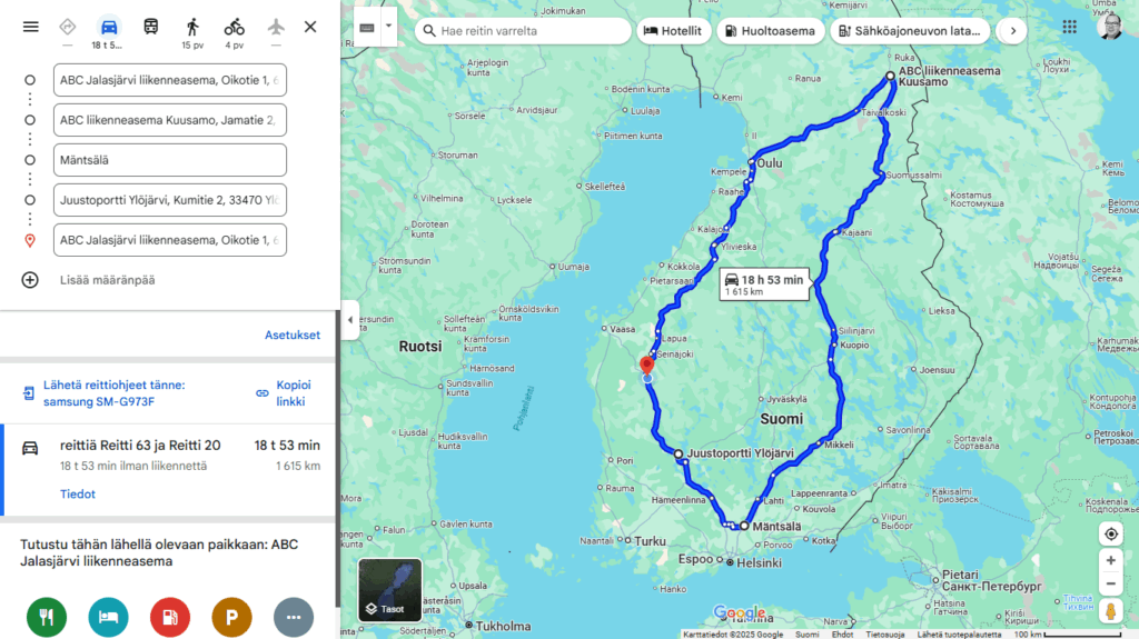 Tämä on ollut vähän niin kuin bucketlistillä niin kauan kuin olen kuullut moisesta. Nyt kuitenkin suunnittelin reitin valmiiksi. Jalasjärvi-Kuusamo-Mäntsälä-Jalasjärvi. Mapsin mukaan matkaa kaikkiaan 1615km. Mun mielestä ihan kiva polku, toki aika yksitoikkoista, mutta jostain kai se on aloitettava. Jalasjärvi-Kuusamo on aika puuduttava väli kun se on niin tuttu, mutta siitä Mäntsälään on oudompaa. Lahden jälkeen saa taas nostaa nopeutta 120kmh tiellä Tampereelle asti niin matka taittuu nopeampaa.