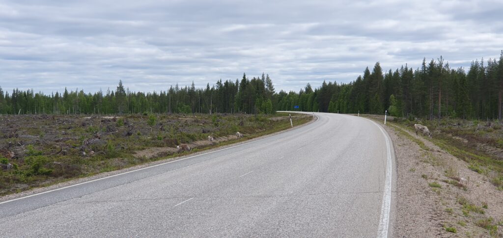 Ei tarvinnut pitkästi mennä kun oli jo ensimmäiset porot tien poskella. Ei ne kovin nopeita ole liikkeissään silloin kun natustavat jotain varpua maasta.