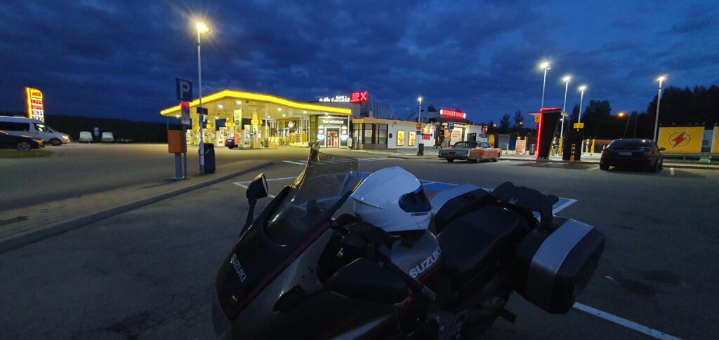 Otin kyllä kuvia tankkauksesta monesta suunnasta ja mietein että ei sille mitään voi. Oli siinä aseman tiedot ja palvelunumero johon olisi voinut soittaa. Otin ne talteen. Ajoin pyörän parkkiin ja kävin pesemässä visiirin. Kello oli vähän yli puolenyön ja ilta oli aika hämärä.