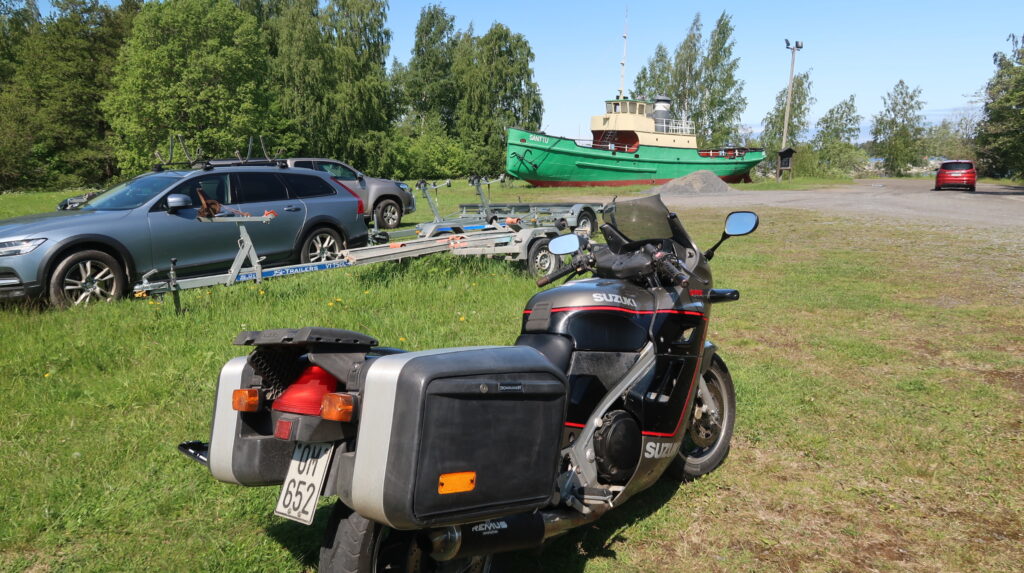 Sitten S/S Santun kohdalla pyörä alkoi pätkimään ja lopulta sammui kokonaan. Lykäsin sen bussipysäkin vierestä nurmen poikki veneenlaskupaikalle. Starttinappi ei ottanut toimiakseen ja kone ei käynyt.