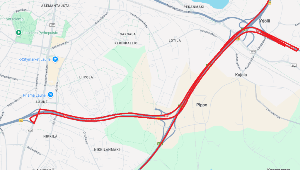 Siispä Lahden kohdalla homma vähän kostautui. Mullahan ei karttaa ollut koko reissulla. Silleen suurpiirteisesti lähdin vain että ajelenpa ensin Kuusamoon ja sitten ABC:ltä tullessa ympyrästä vasempaan vitostielle ja siitä Mäntsälään asti.