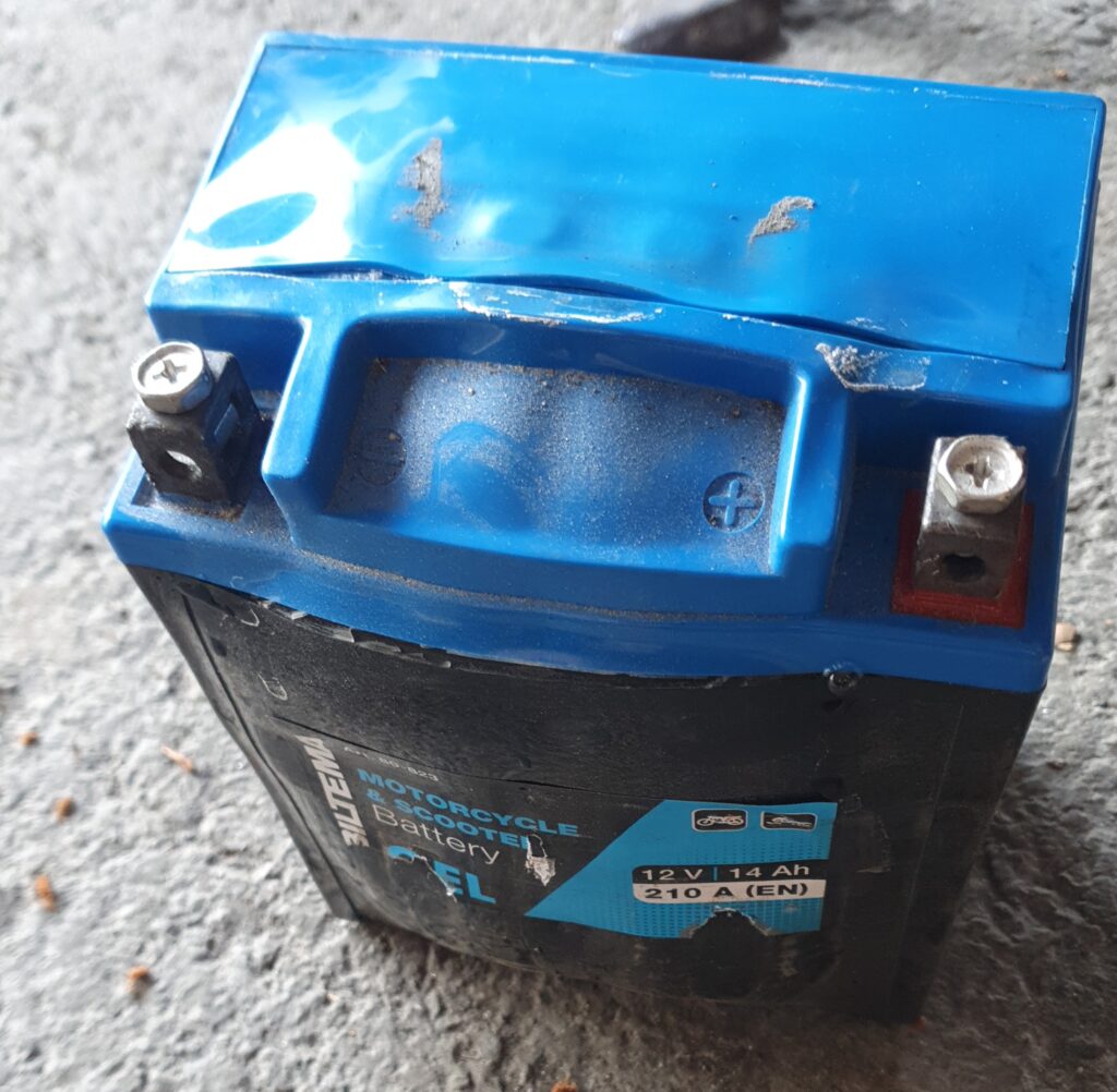 Lähti kuitenkin hienosti käyntiin ja ajattelin tosiaan ajaa sen Alavuden kautta kotiin. Eikä siinä mitään hienosti se pelitti, vaan kotia päästyäni kun katsoin penkin alle, oli akku tosiaan paisunut aikalailla ja savu tai hyöry puski penkin alta.