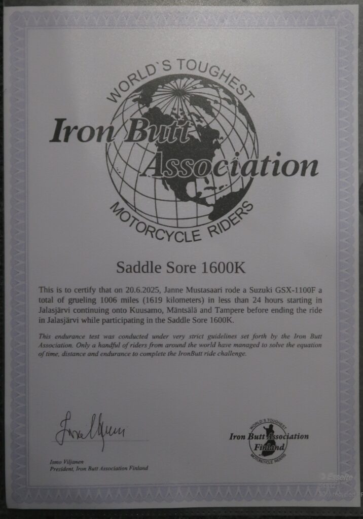 Tuollaisen kunniakirjan sain ajosta. Saapa nähdä tuleeko näitä lisää. Jotenkin kiehtoisi se SS1000 ja onhan noita ajoja muitakin. Näin jonkin ajan kuluttua tuntuu että miksipä ei, kyllä siinä ihan kivasti näkee Suomea kuitenkin. Pitää vain suunnitella joku toinen reitti, jotenkin olisi kiva nähdä tuota Turun suuntaa ja ehkä pistäytyä Hatsapurille Puumalaan.